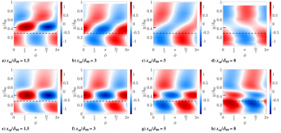 This direction formulates spatial input-output analysis, which is spatial marching in streamwise direction, while temporal domain is Fourier transformed into frequency domain. This is in particular suitable to consider the spatial developing effect. Figure below shows a comparison between experimental results (top row) and spatial input-output analysis (bottom row). The spatial input-output analysis is able to capture the downstream evolution effect in turbulent boundary layer flows.